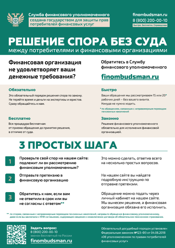 Если спор с финансовой организацией не урегулирован – подайте обращение финансовому уполномоченному на его официальном сайте или через МФЦ вашего региона.